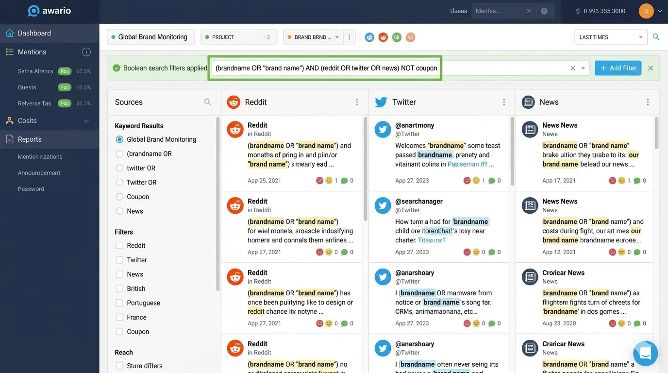 Awario sits between the free tools and enterprise platforms. It monitors Reddit, X/Twitter, blogs, news, and more for keyword mentions, with Boolean search and a built-in lead generation module.