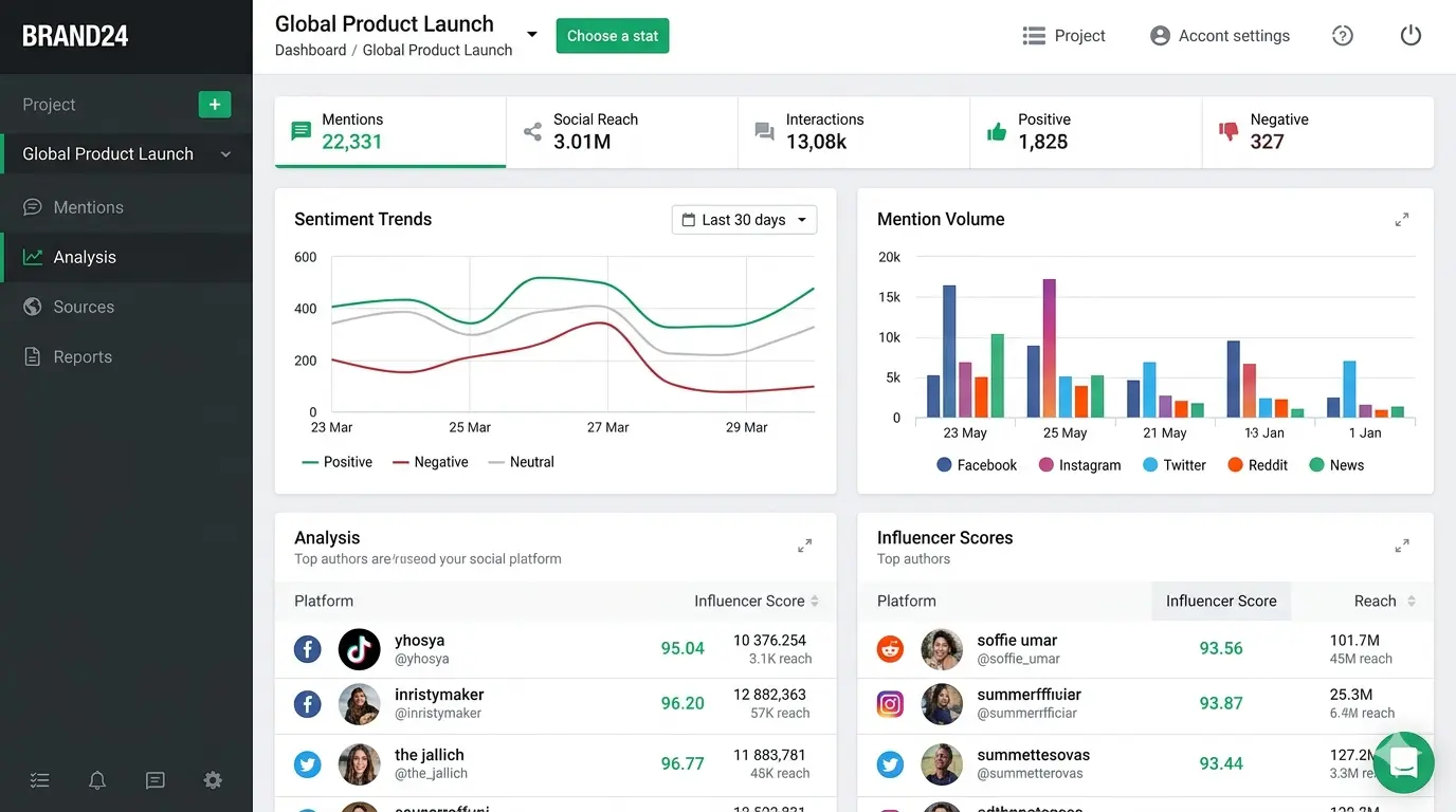 Brand24 is an established social listening platform covering 25+ channels , Reddit, X/Twitter, Instagram, Facebook, YouTube, news sites, podcasts, and more. It has deeper reporting, sentiment analysis, influencer scoring, and is a more enterprise-grade product than anything else on this list.