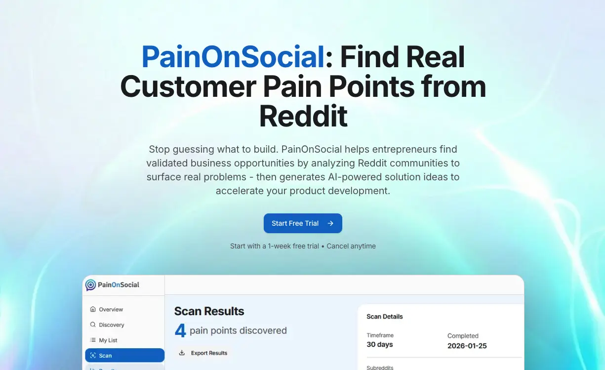 PainOnSocial focuses specifically on surfacing pain points from Reddit and other social communities, scoring each one on a 0–100 scale for signal quality. It's a direct alternative to Reddinbox's pain point research workflow, with a curated subreddit approach and AI scoring built around finding the highest-value conversations.
