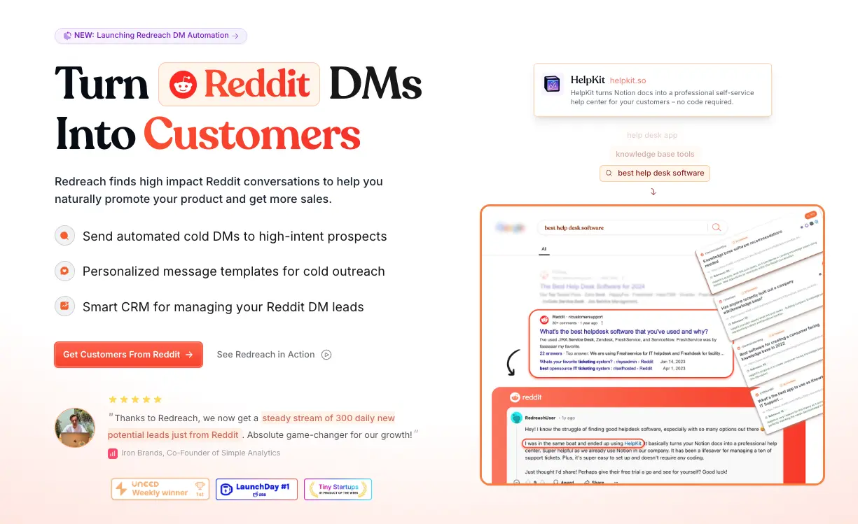Redreach takes a different angle entirely: instead of market research, it's focused on finding and engaging potential leads on Reddit. If you were primarily using GummySearch to identify people to pitch or reach out to, Redreach is more directly built for that workflow, with lead scoring and outreach features baked in.