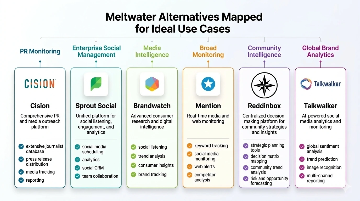 The strongest Meltwater alternative depends on what you're actually trying to solve. PR and media relations, Cision.