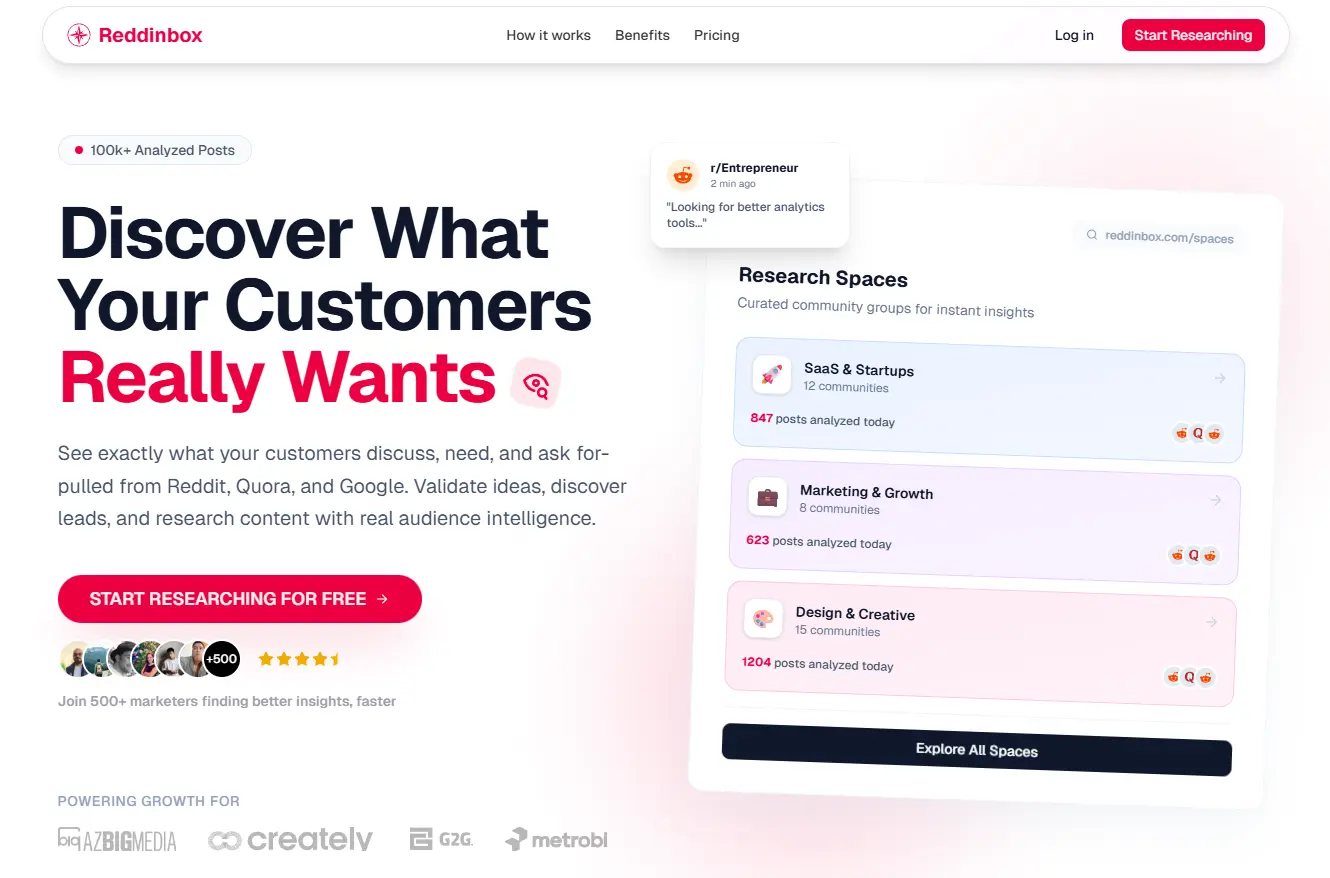 Tools like Reddinbox specialize in mining Reddit and Quora discussions, surfacing unfiltered customer insights from thousands of real conversations about problems, competitors, and buying intent.