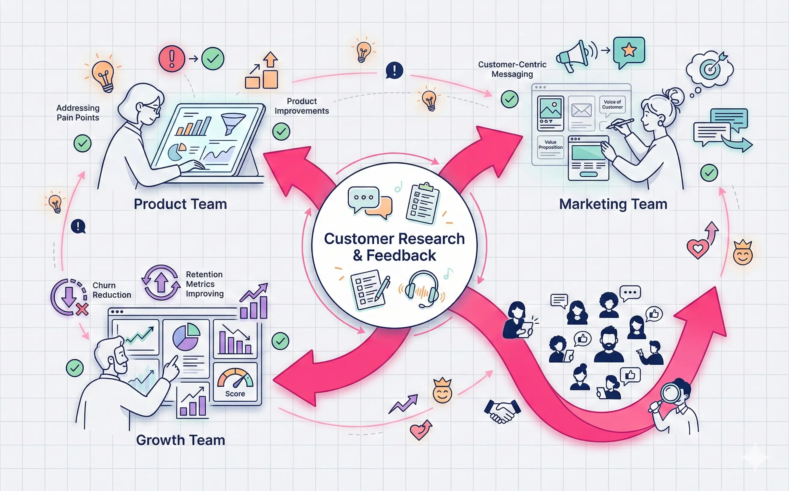 Customer research sits at the intersection—it's about understanding who your customers are, what problems they face, and how they make decisions.