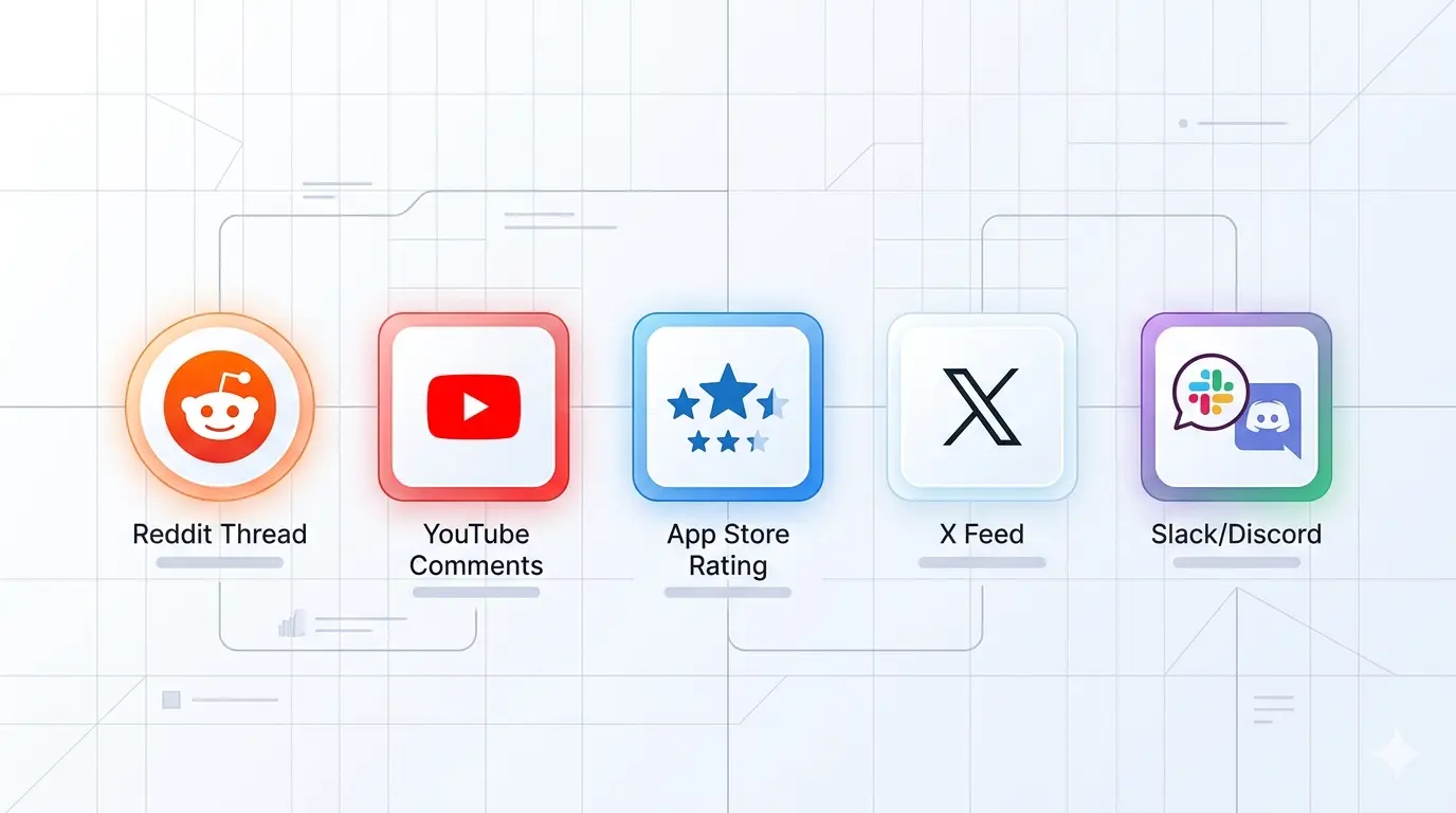 Community platforms are the answer. Reddit, YouTube comment sections, G2 and Capterra reviews, X, and niche Slack communities contain millions of unsolicited, unfiltered complaints from people with no incentive to be polite. You don't need to recruit anyone or schedule a call — you need to find where your target customers vent and read at scale. The five channels in this guide are the starting point; the main skill is learning to distinguish frequency from noise.
