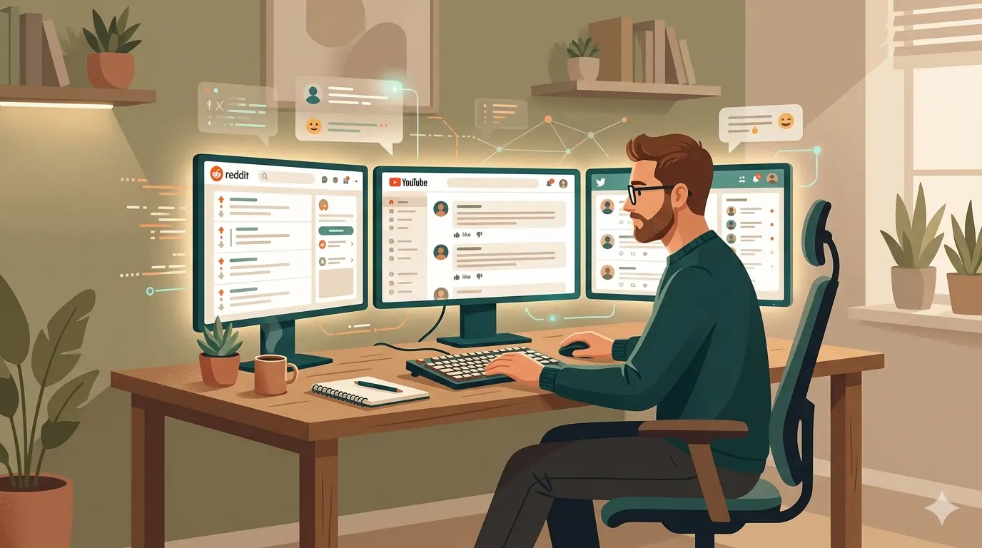 The real insight that breaks this loop: your target customers are already describing their problems online. They're posting on Reddit, complaining in YouTube comment sections, and leaving one-star reviews on the tools they're using as a workaround. That conversation is happening whether you show up or not.
