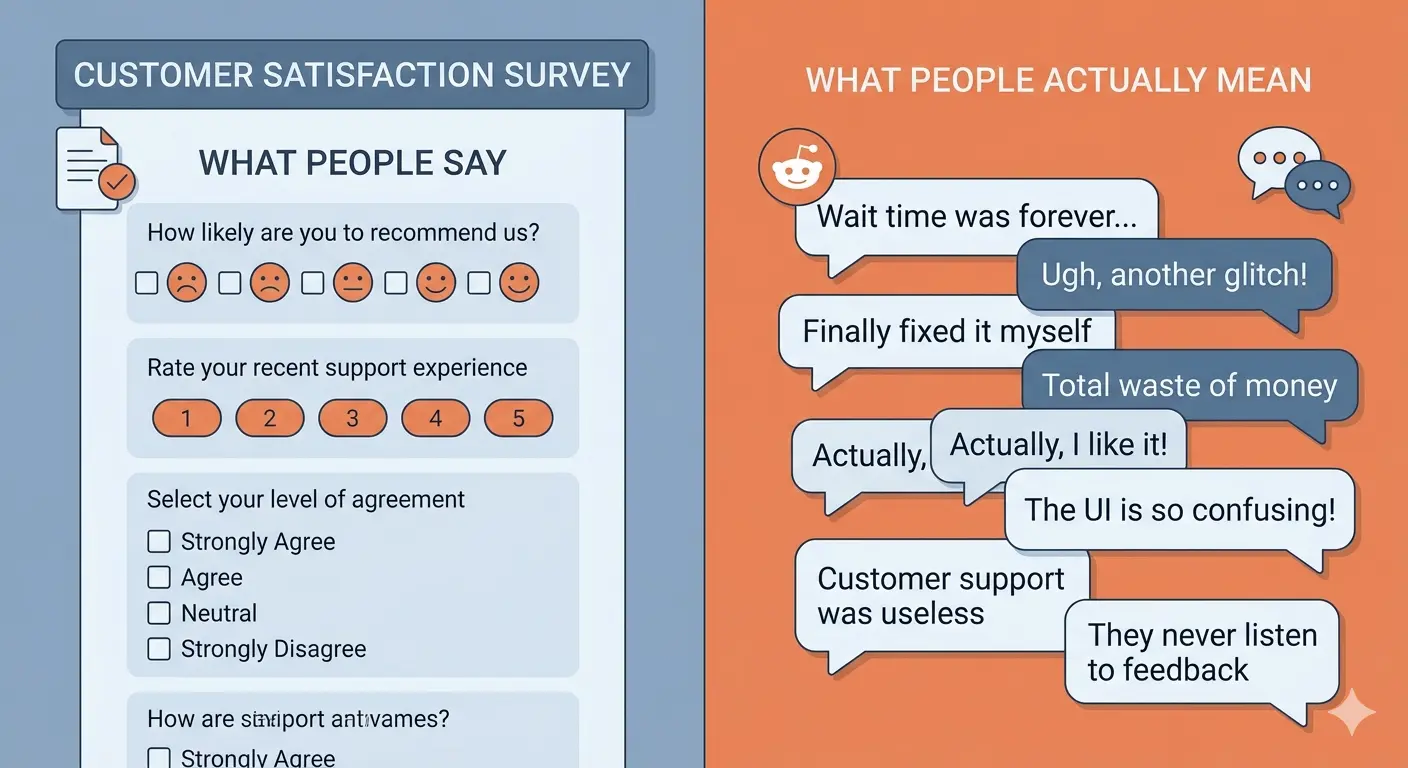 Surveys give you what people think you want to hear. Reddit gives you what they actually say at 11pm when they're venting to strangers.